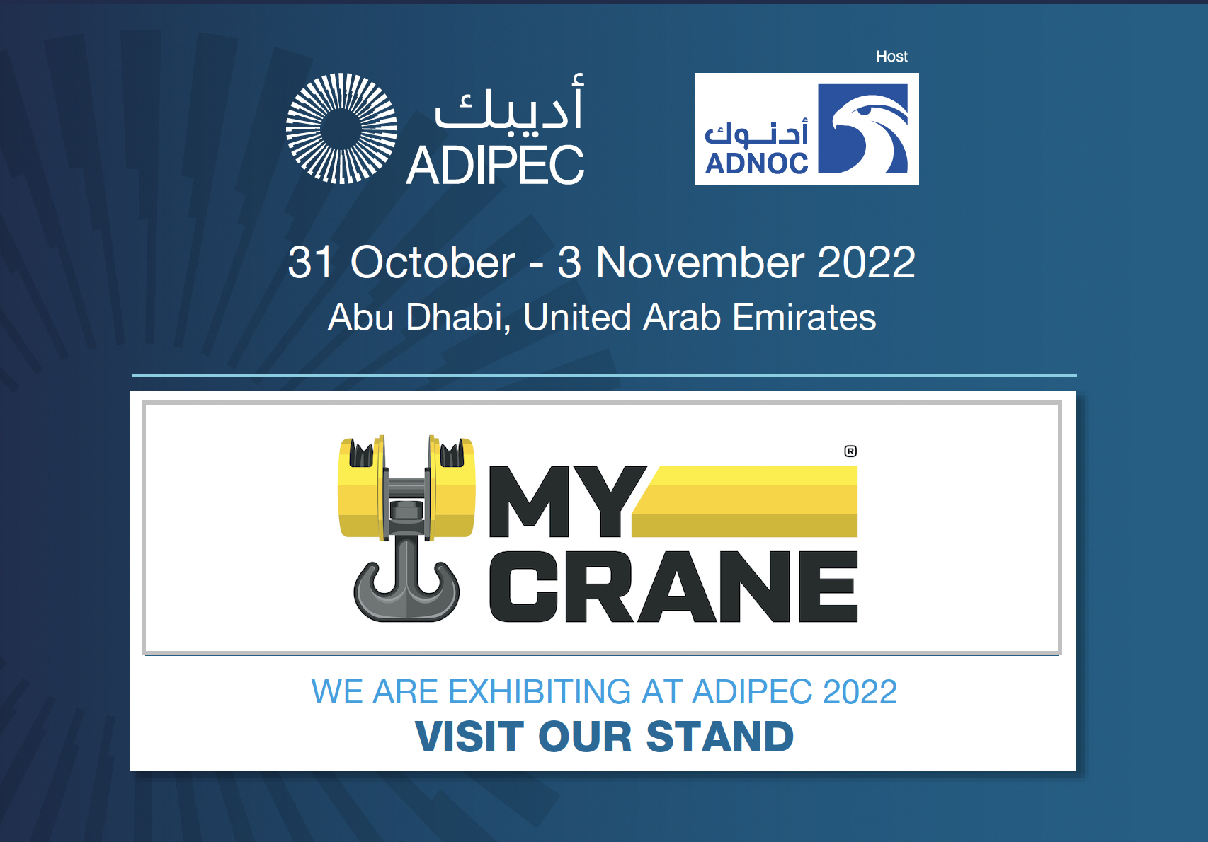 Adipec is where the world’s energy community gathers to meet – and MYCRANE is taking part to explain how we can help energy clients save time and money in the crane rental procurement process.