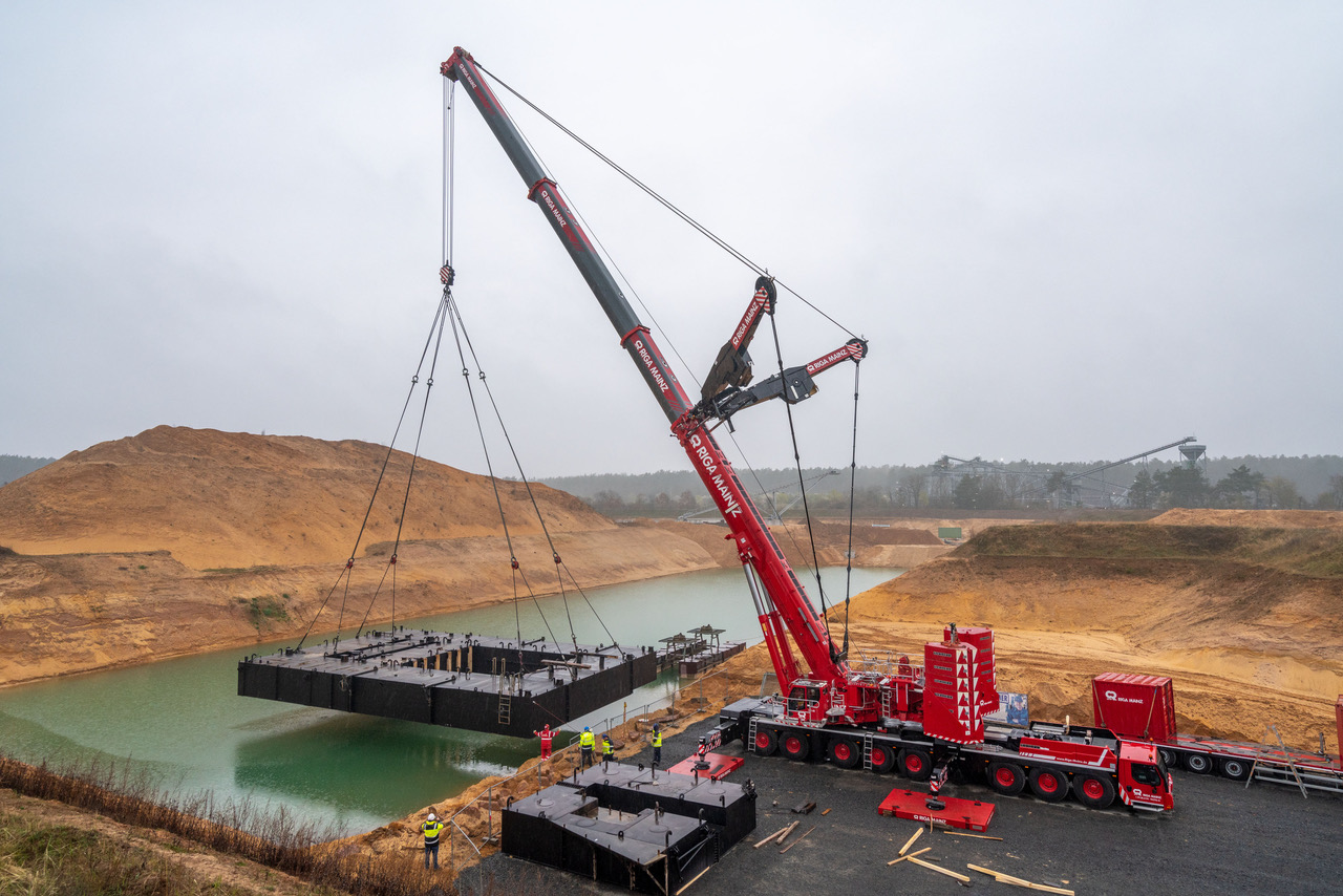 Crane and heavy haulage contractor Riga Mainz deployed a Liebherr LTM 1650-8.1 to position a 70 tonne pontoon in a flooded gravel pit.