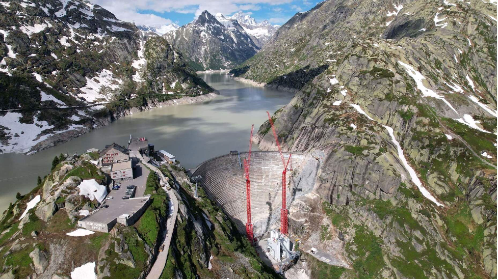 Two WOLFF 1250 B luffing jib cranes will be deployed at Lake Grimsel, Switzerland for the next four years to facilitate the replacement of the Spitallamm dam.